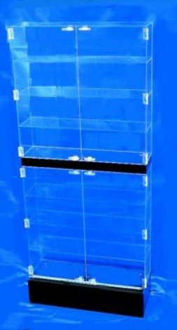 Two large capacity display cases attached to a black bottom base with both attached to a mid black riser. Threaded metal inserts secure the cases with included dark bronzed flat head dress bolts.
