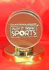 in a gold colored base. Crystal clear molded display cover protects a Puck from weathering and wear. Clear Display cover lifts out of the base and separates to accept puck. Comes in a gift wrap-able box. In stock, ships within 48 hrs!